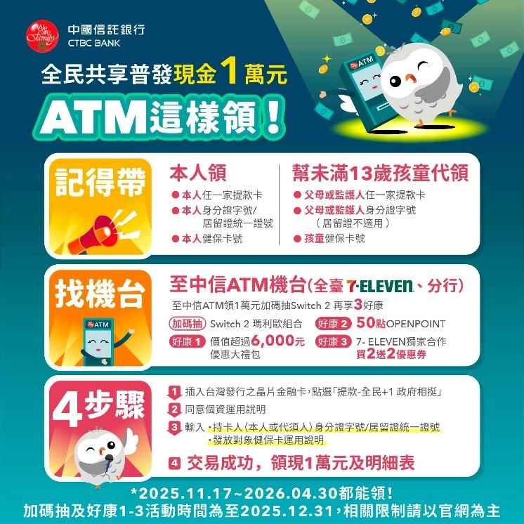 領取此次普發一萬的資格包含國內現有戶籍國民、有居留許可的外國人、取得居留許可的中港澳及外國配偶...等,想透過 ATM 領取可在 2025/11/17-2026/04/30 至7-ELEVEN 中信 ATM 或中信分行 ATM 領取,普發一萬相關資訊、條件和領取流程幫大家整理在下方: