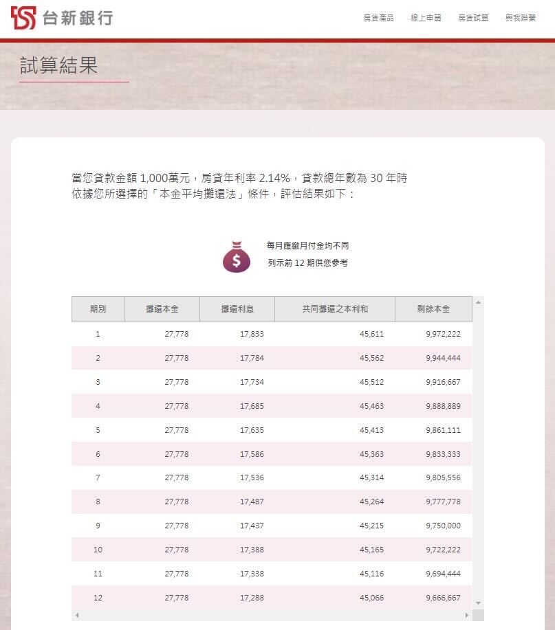 (本金平均攤還試算 1000 萬房貸。圖片來源:台新銀行房貸每月還款金額試算)