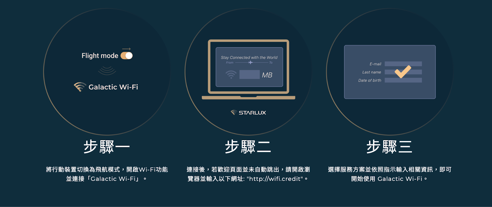 - Step 1. 切換飛航模式:切換為飛航模式後開啟 Wi-Fi 並連接「Galactic Wi-Fi」
