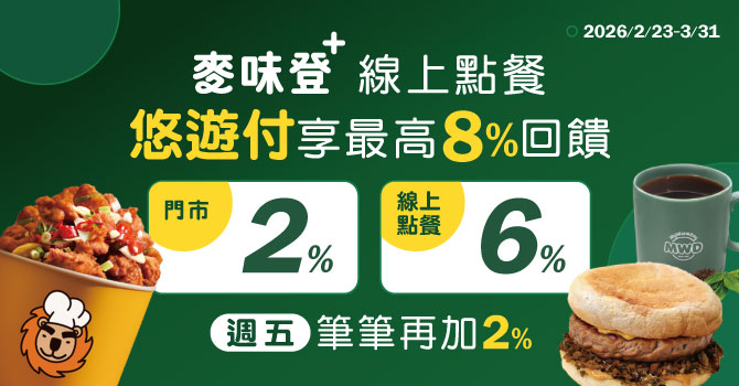 2026/3/31 前,於「麥味登+」APP線上點餐並選用「悠遊付」之錢包或綁定銀行帳戶進行扣款支付,每筆扣款交易享6%悠遊付回饋金,每戶每月最高回饋上限為30元。本活動設有每月總回饋金額上限:2月總回饋上限為3萬。3月總回饋上限為10萬。*適用品牌:麥味登、炸雞大獅