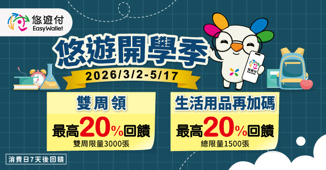 2026/5/17 前,悠遊付會員於「悠遊開學季指定店家」,掃描活動專屬QR Code,即可領取「$20元悠遊付現金回饋券」,每位悠遊付會員每雙週限領取乙次,每雙週回饋名額限量3,000張。本活動總回饋上限為12,000張。