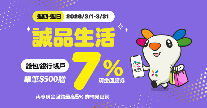 2026/3/1~2026/3/31,週四~週日於誠品生活指定門市,使用悠遊付錢包或綁定銀行帳戶扣款單筆消費滿500元以上,即可獲得7%悠遊付現金回饋券1份,單筆不累贈,每戶回饋上限3份,活動限量1,800份。回饋份數如達上限,則活動提前結束,並於悠遊付APP內公告;本活動可與「月級挑戰-筆筆最高3%回饋」、「週五會員日回饋2%」活動疊加,活動期間週五於誠品生活指定門市使用悠遊付錢包或綁定銀行帳戶消費享最高5%現金回饋。