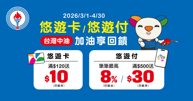 活動期間於台灣中油直營加油站或部分指定加盟加油站消費,使用悠遊付錢包或綁定銀行帳戶扣款,單筆滿500元即贈30元悠遊付現金回饋券(單筆不累贈),回饋券1,500張/月,送完為止。