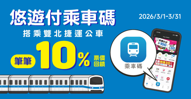 2026/3/1~2026/3/31,使用悠遊付乘車碼搭乘雙北捷運或公車,筆筆享票價10%回饋,每戶回饋上限100元,回饋總金額上限75萬元。*活動期間同享「月級挑戰-筆筆最高3%回饋」、「週五會員日回饋2%」活動疊加,每週五使用悠遊付乘車碼搭雙北捷運或公車,最高享15%回饋。