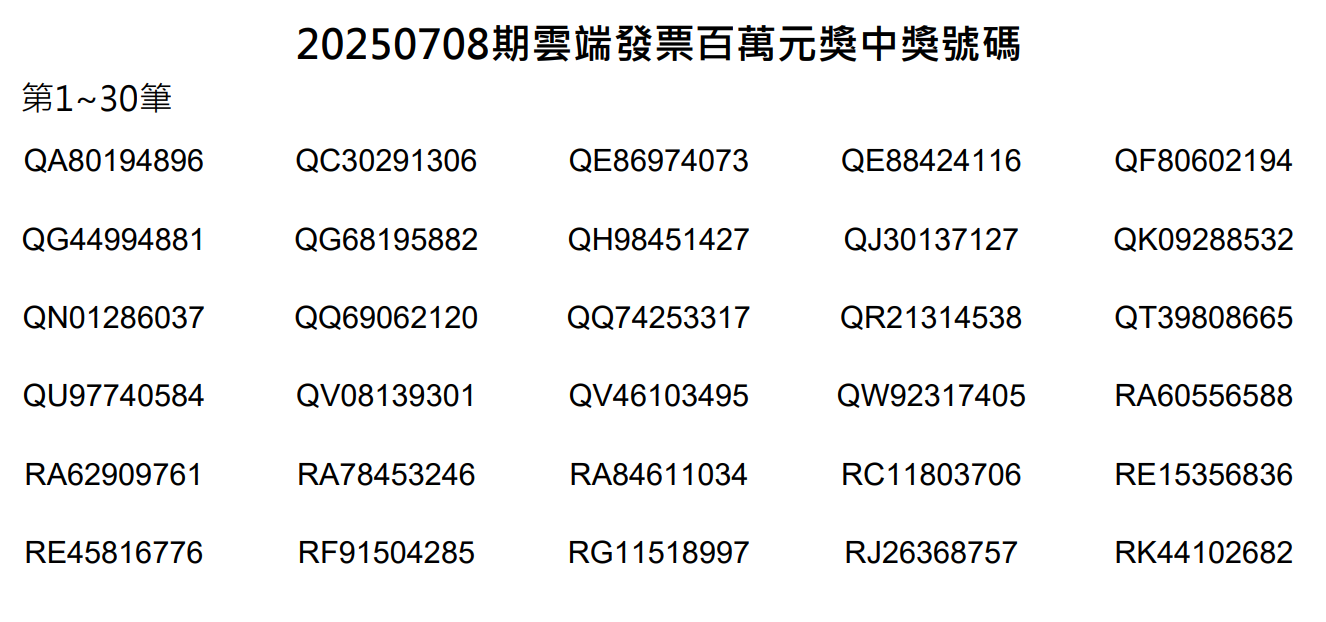 財政部日前已公布最新 2025年7月與8月雲端發票專屬獎中獎獎號,包含百萬元、2,000 元、800 元、500 元及 200 元 5 大獎項詳細獎號可至財政部稅務入口網查詢,想知道自己是不是幸運兒快到財政部官網查詢。以下拉出百萬元幸運大獎得主號碼,快來看看自己中頭獎了沒!